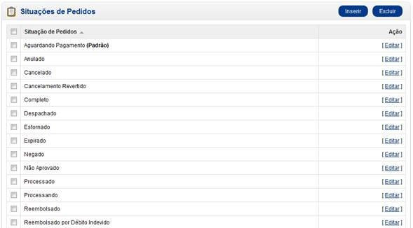 Remete aos estados que um pedido pode assumir. A e-Loja possui 14 por padrão, que podem ser excluídos, modificados ou adicionados.